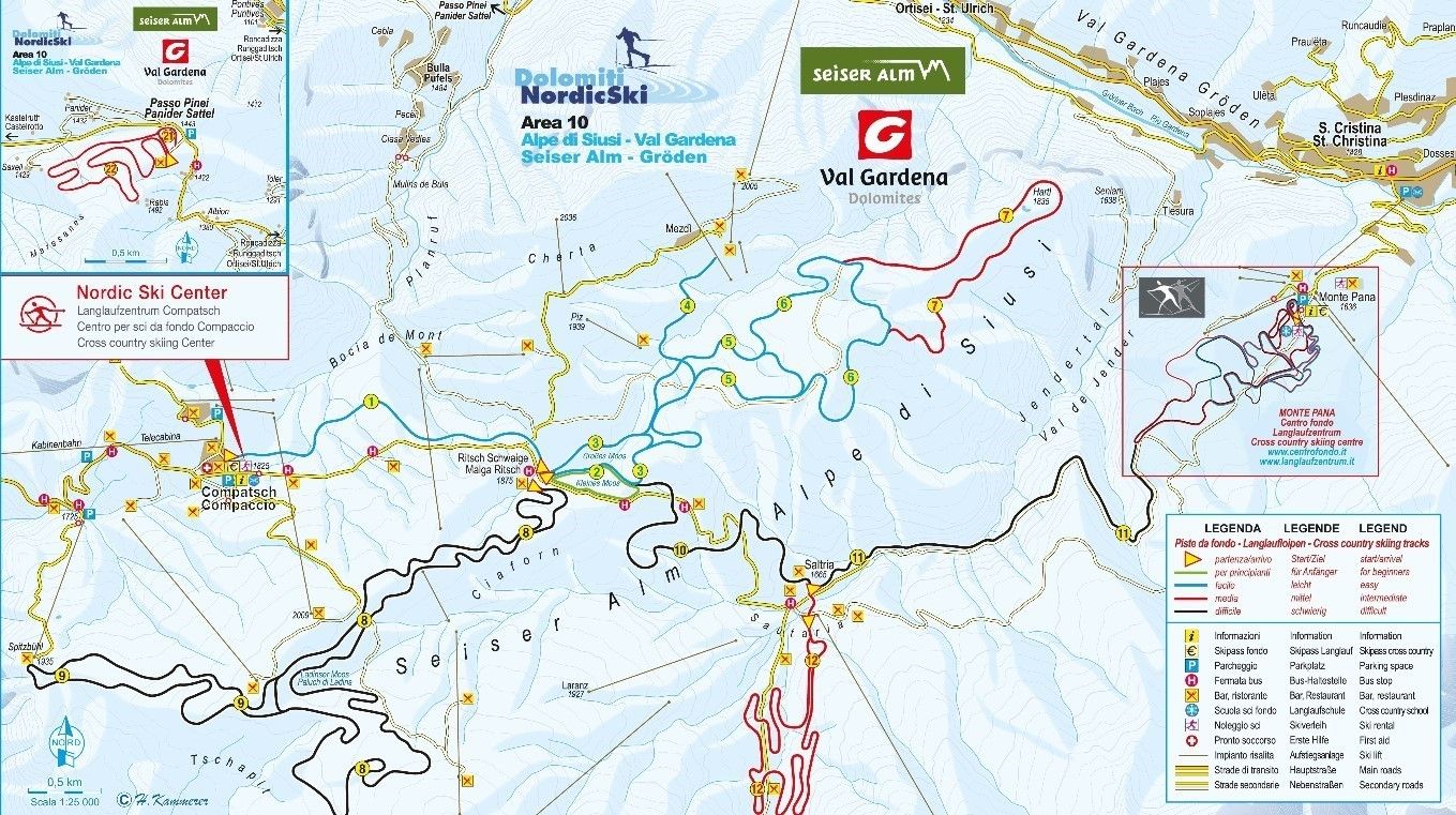Alpe di Siusi betragtes som et særligt populært langrendsområde i Sydtyrol på grund af sin fantastiske beliggenhed på de solbeskinnede højsletter på Sciliar-massivet. De mere udfordrende langrendsløjper gør, at langrend her anbefales til sportslige langrendsløbere. Men de mere afslappede skiløbere vil også få fuld valuta for pengene. En anbefaling her er den 12 km lange højdeløjpe mellem 1.620 og 1.810 meter, der går fra Selva gennem Vallunga. Den 30 km lange højdeløjpe ved Monte Pana har meget at byde på for dem, der vil træne i større højder.